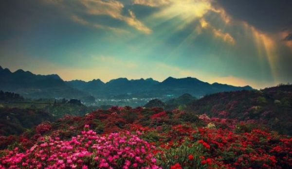 贵州省毕节市百里杜鹃风景名胜区普底乡百里杜鹃风景名胜区,位于大方、黔西两县交界处,距省会贵阳155公里,是迄今为止中国已查明的面积最大的原生杜鹃林,总面积达125.8平方公里,百里杜鹃以此得名。