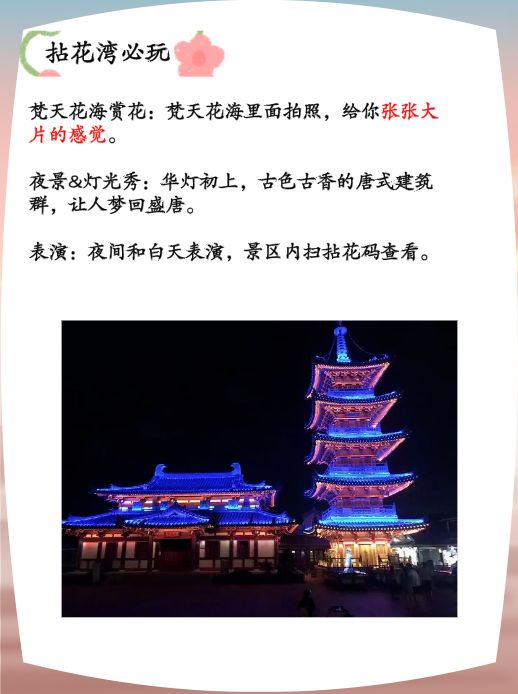 夜景&灯光秀:华灯初上,拈花湾里的景观灯悉数亮起,一场唐风光影秀正式开启。古色古香的唐式建筑群在灯光的勾勒下,让人梦回盛唐。建议美女们穿上汉服,拿上精致的小灯笼、古色古香的街道,搭配上灯光秀,这些元素集合在一起非常出片。