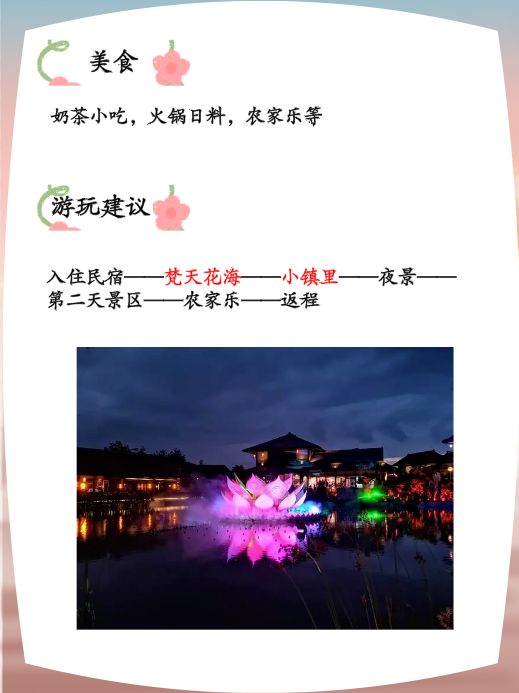 办完民宿入住先去梵天花海,然后到小镇里(拈花塔,五灯湖广场,梵天花海,香月花街,微笑广场)游玩,晚上看夜景看表演,第二天睡个懒觉,再到景区里随便转转,中午去附近吃个农家乐,然后回程。这样安排整个游玩过程比较宽松舒适。