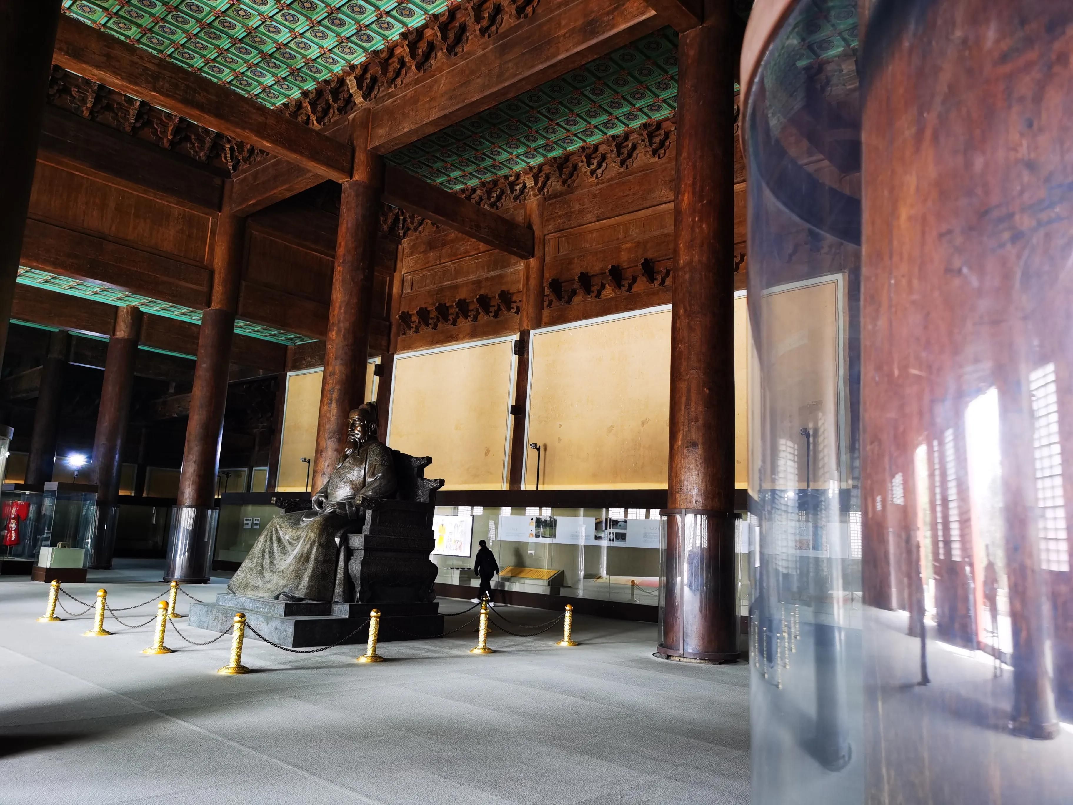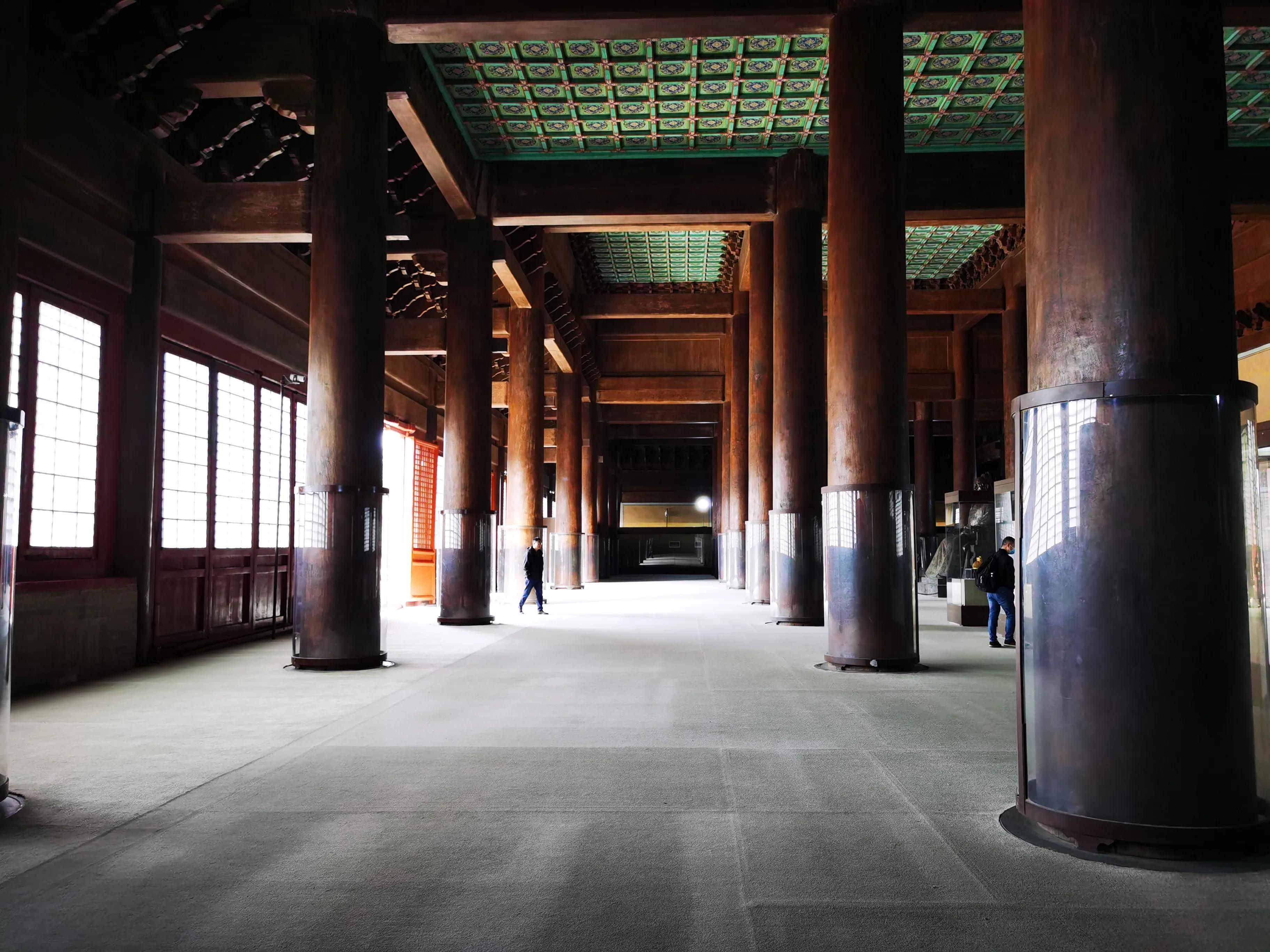殿内的所有木件全都是用金丝楠木制作的,直径一米多,高十几米的六十根金丝楠木大柱,托着2000平方米的重檐庑殿顶,而殿内都是金砖铺地。