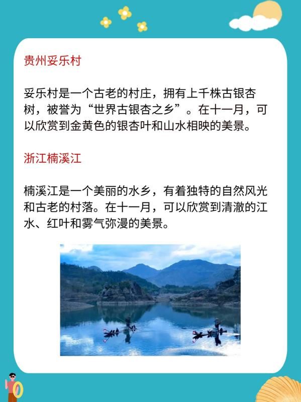 浙江楠溪江:楠溪江是一个美丽的水乡,有着独特的自然风光和古老的村落。在十一月,可以欣赏到清澈的江水、红叶和雾气弥漫的美景。