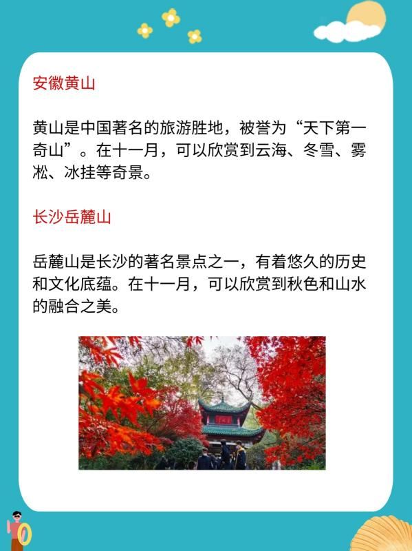 长沙岳麓山:岳麓山是长沙的著名景点之一,有着悠久的历史和文化底蕴。在十一月,可以欣赏到秋色和山水的融合之美。