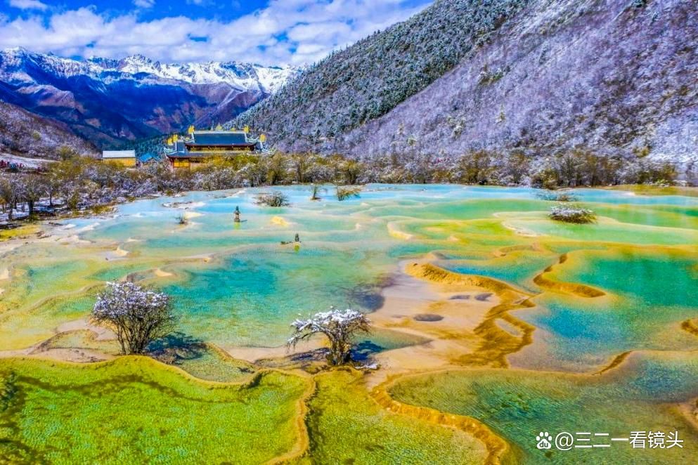 黄龙的秋天,金黄中透着碧绿,碧绿中又泛着金光,更加绚丽多彩,斑斓的彩池与似黄非黄的群山构成一幅景色宜人的秋季胜景。