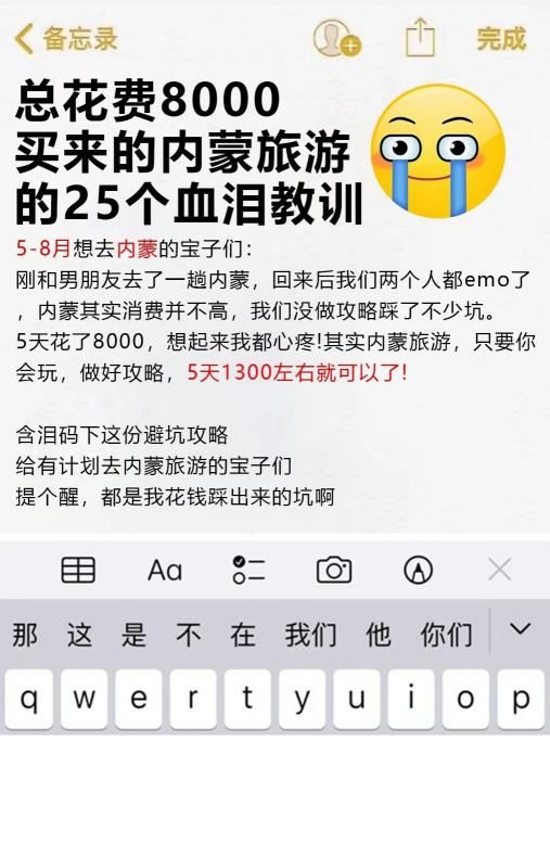 刚和男朋友去了一趟内蒙, 回来后我们两个人都emo了内蒙其实消费并不高,我们没做攻略踩了不少坑。5天花了8000,想起来我都心疼!其实内蒙旅游,只要你会玩,做好攻略,5天1300左右就可以了!
