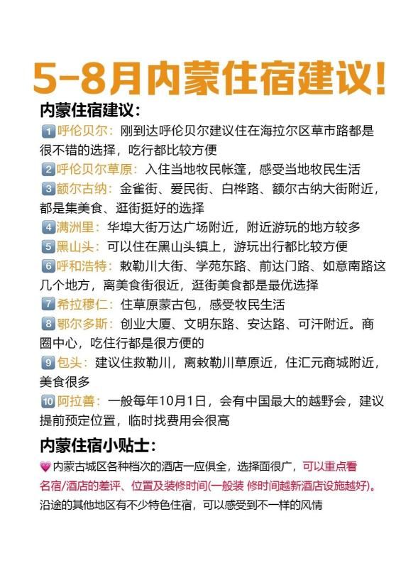 内蒙古城区各种档次的酒店一应俱全,选择面很广,可以重点看名宿/酒店的差评、位置及装修时间(一般装修时间越新酒店设施越好)。沿途的其他地区有不少特色住宿,可以感受到不一样的风情