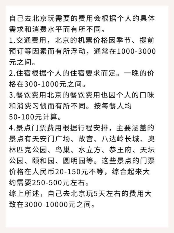 综上所述,自己去北京玩5天左右的费用大致在3000-10000元之间。