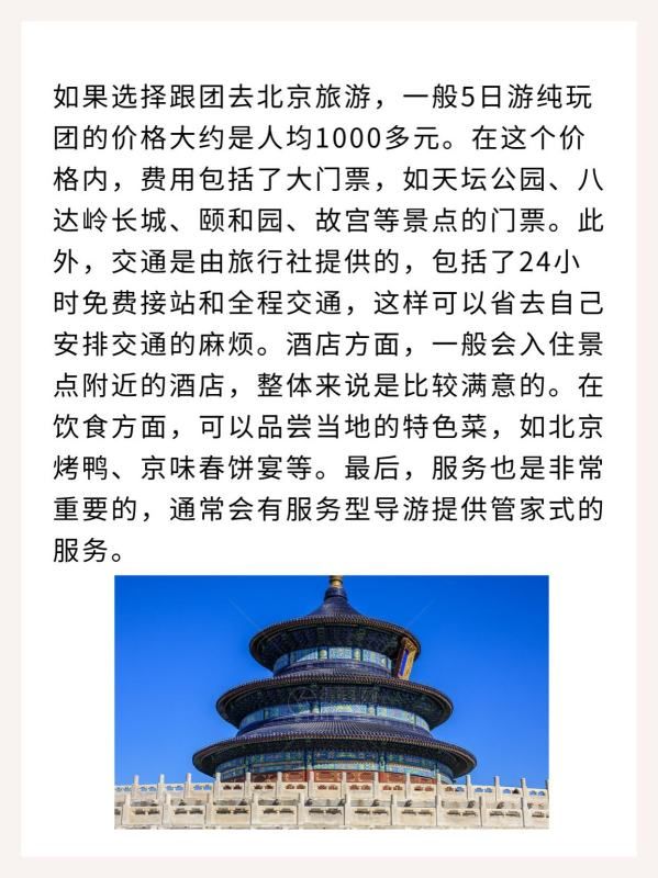 如果选择跟团去北京旅游,一般5日游纯玩团的价格大约是人均1000多元。在这个价格内,费用包括了大门票,如天坛公园、八达岭长城、颐和园、故宫等景点的门票。此外,交通是由旅行社提供的,包括了24小时免费接站和全程交通,这样可以省去自己安排交通的麻烦。酒店方面,一般会入住景点附近的酒店,整体来说是比较满意的。在饮食方面,可以品尝当地的特色菜,如北京烤鸭、京味春饼宴等。最后,服务也是非常重要的,通常会有服务型导游提供管家式的服务。