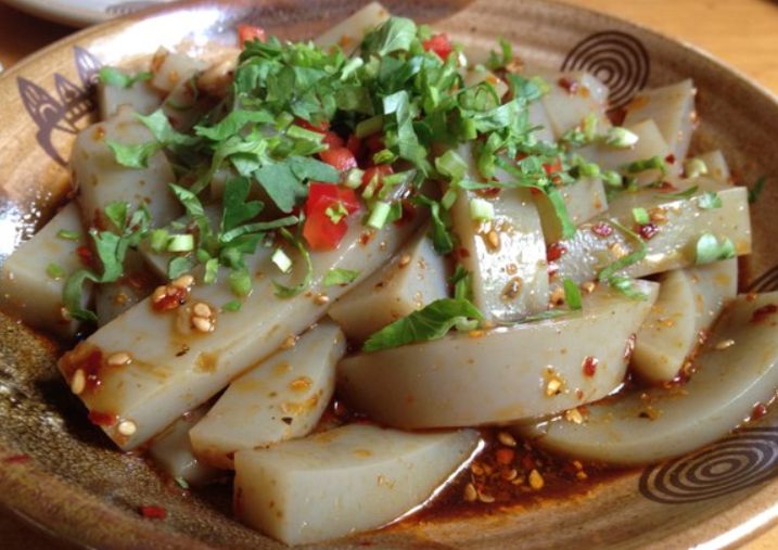 鸡豆凉粉是丽江的传统凉菜之一,以其清爽的口感和独特的调味品而受到人们的喜爱。制作鸡豆凉粉的关键在于豆粉的制作和凉粉的制作。首先,将花豆煮熟,然后用石磨磨成细豆粉。接下来,将豆粉加水煮沸,冷却后凝固成豆凉粉。将凉粉切成薄片,配上鸡肉丝和各种调味品,如酱油、醋、辣椒油等。鸡豆凉粉的口感清爽爽口,酸辣可口,是夏天消暑的理想选择。