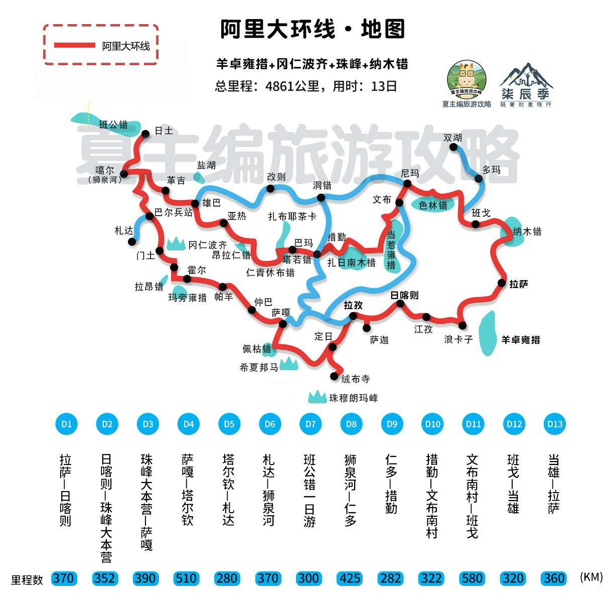 旅游信息:总里程4861公里,自驾需13日,人均预算费用4500元。