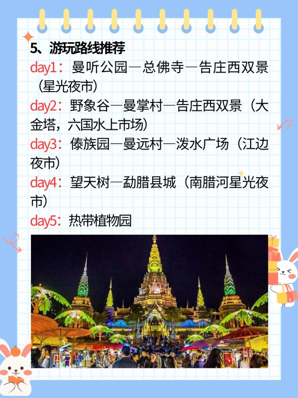 曼听公园—总佛寺—告庄西双景(星光夜市)—野象谷—曼掌村—告庄西双景(大金塔,六国水上市场)—傣族园—曼远村—泼水广场(江边夜市)—望天树—勐腊县城(南腊河星光夜市)—热带植物园。