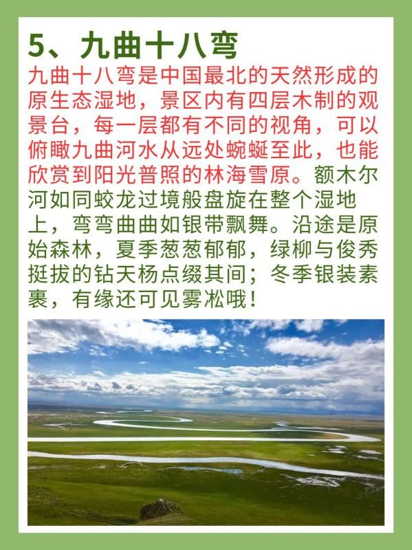 九曲十八弯是中国最北的天然形成的原生态湿地,景区内有四层木制的观景台,每一层都有不同的视角,可以俯瞰九曲河水从远处蜿蜒至此,也能欣赏到阳光普照的林海雪原。额木尔河如同蛟龙过境般盘旋在整个湿地上,弯弯曲曲如银带飘舞。沿途是原始森林,夏季葱葱郁郁,绿柳与俊秀挺拔的钻天杨点缀其间;冬季银装素裹,有缘还可见雾凇哦!
