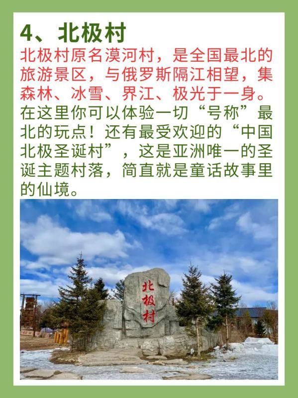 北极村原名漠河村,是全国最北的旅游景区,与俄罗斯隔江相望,集森林、冰雪、界江、极光于一身。在这里你可以体验一切“号称”最北的玩点!还有最受欢迎的“中国北极圣诞村”,这是亚洲唯一的圣诞主题村落,简直就是童话故事里的仙境。