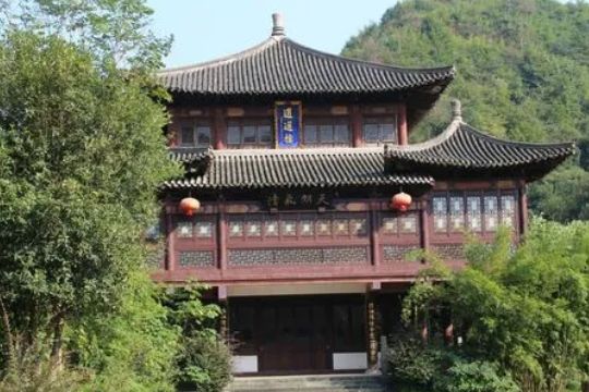 重阳宫距新昌城西20公里,地处穿岩十九峰风景名胜区,深藏于山峦环抱、碧水流淇的桂竹谷中。这一带,六朝有高道葛洪、顾欢、魏伯阳、褚伯玉、许迈、王羲之、谢灵运韬晦栖游,盛唐有高道司马承祯、吴筠、李白求仙隐逸,素为浙东之道教胜地。