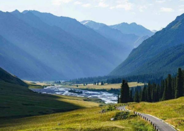 新疆伊犁州特克斯县276乡道南100米,背靠巍峨雪山,草原上有树林、花海等景观,景色辽阔秀美,是观光摄影的绝佳地。