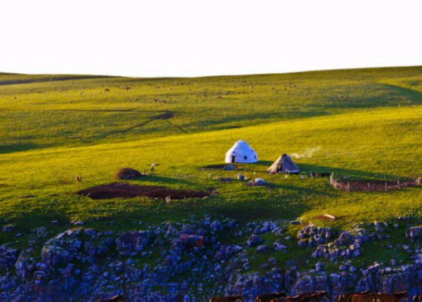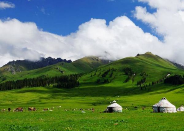 新疆伊犁夏塔草原辽阔坦荡,宛如烟波浩森的大海一望无际。这里草场丰美,颇有天苍苍,野茫茫,风吹草低见牛羊的景象。