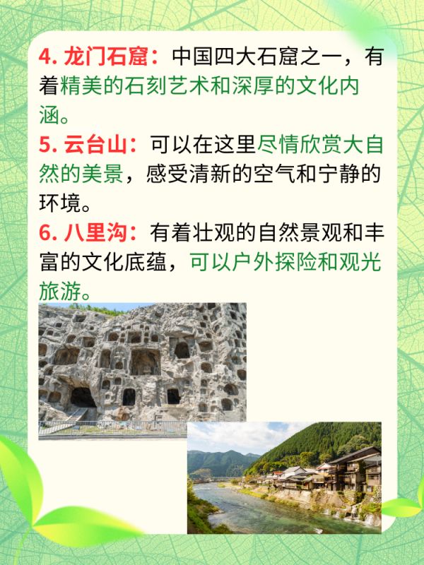 5. 云台山:这里山清水秀,风景优美,是休闲度假的好去处。游客可以在这里尽情欣赏大自然的美景,感受清新的空气和宁静的环境。