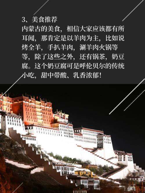 在内蒙自由行路线中,品尝当地美食也是必不可少。这里推荐几个值得一试的特色菜肴: