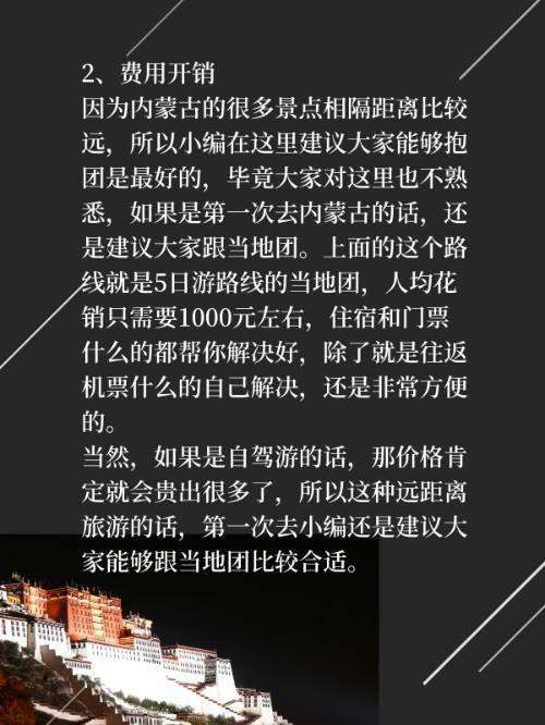 因为内蒙古的很多景点相隔距离比较远,所以小编在这里建议大家能够抱团是最好的,毕竟大家对这里也不熟悉,如果是第一次去内蒙古的话,还是建议大家跟当地团。上面的这个路线就是5日游路线的当地团,人均花销只需要1000元左右,住宿和门票什么的都帮你解决好,除了就是往返机票什么的自己解决,还是非常方便的。