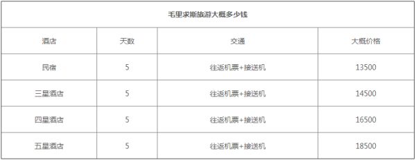 计划旅行的时候首先要做的肯定是规划好自己的行程,预算好旅行的大概费用。如果想去毛里求斯旅游,主要费用如下。至于花多少钱,就看大家对自己旅途提问的规划了。