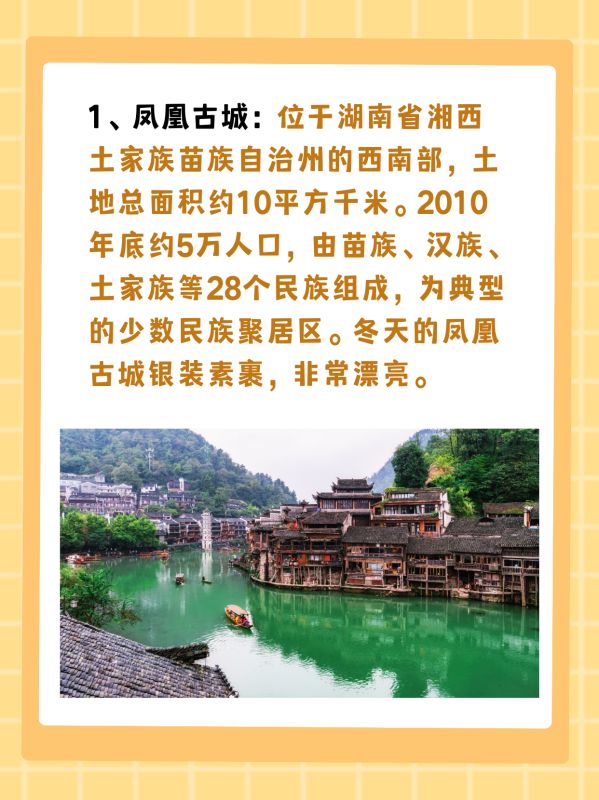 1、凤凰古城:位于湖南省湘西土家族苗族自治州的西南部,土地总面积约10平方千米。2010年底约5万人口,由苗族、汉族、土家族等28个民族组成