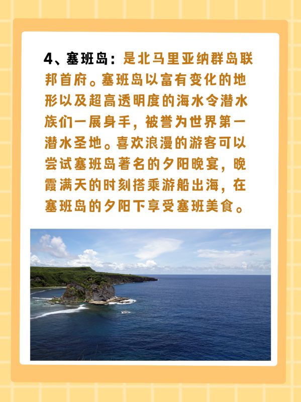 4、塞班岛:是北马里亚纳群岛联邦首府。塞班岛以富有变化的地形以及超高透明度的海水令潜水族们一展身手,被誉为世界第一潜水圣地