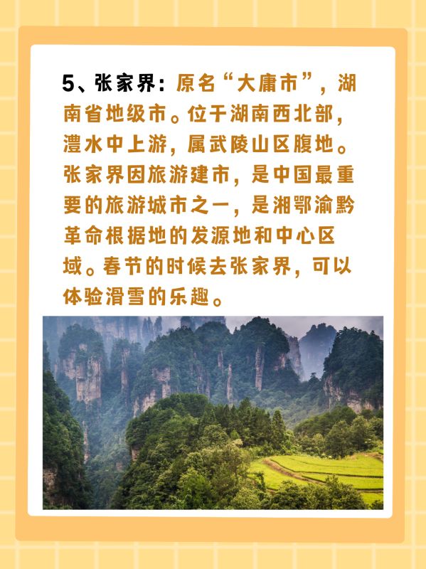 5、张家界:原名“大庸市”,湖南省地级市。位于湖南西北部,澧水中上游,属武陵山区腹地。张家界因旅游建市,是中国最重要的旅游城市之一