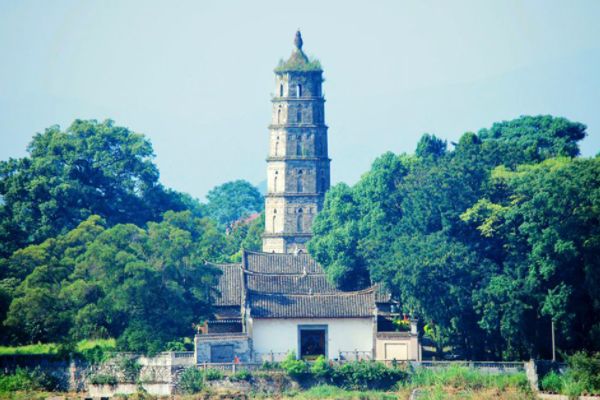 富川瑞光塔位于县城的富江西畔,江水清碧,充满讲情画意,塔为楼阁式砖塔,高28米,分为7层,呈递收上升。塔内有螺旋式砖梯78级,环形而上,可直达顶层。塔顶尖用重达400公斤的铜墙铁壁盖顶,建于明嘉靖三十年(1555年)春,数百来,历经苍桑,依旧巍然屹立。