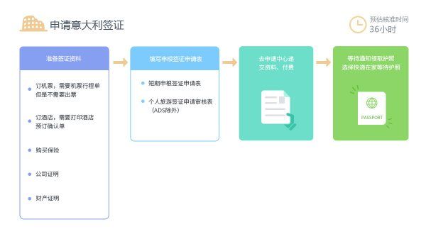 意大利的签证由于近几年来过签率比较高,几乎成为大多数前往申根国家的中国旅客首选递签国家之一。与其他申根国家类似,意大利的签证办理也是通过指定的签证服务中心进行,申请者需要按照IVAC网站上的材料核对表准备完整的签证资料,然后前往服务中心递交。 2014年7月1日开始北京意大利驻华使馆及上海、广州领事馆开始实施针对个人旅游签证和商务签证36小时出签的快速签证政策,签发结果由签证中心电话通知申请者。
