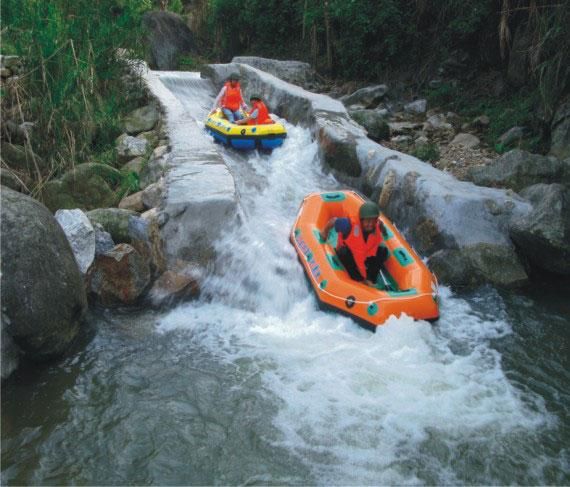 容县将军河位于容县黎村镇六振村和民国将军黄绍竑故居所在地珊萃村旁,漂流的河道约3500米长,全程落差150米,最高单级落差就有7米,漂完全程要1个多小时。乘坐橡皮船从起点码头滑道起漂,跌宕起伏顺流直下,河水清澈见底,水流急缓有续,漂流活动融合了惊险、刺激、浪漫与奇趣。
