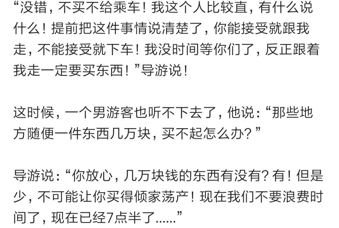 除了上回游客要求乘客不能在车上睡觉,这一次的导游,更是直接在出发之前宣布,不买东西的不要上车。
