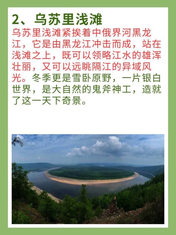 乌苏里浅滩紧挨着中俄界河黑龙江,它是由黑龙江冲击而成,站在浅滩之上,既可以领略江水的雄浑壮丽,又可以远眺隔江的异域风光。冬季更是雪卧原野,一片银白世界,是大自然的鬼斧神工,造就了这一天下奇景。