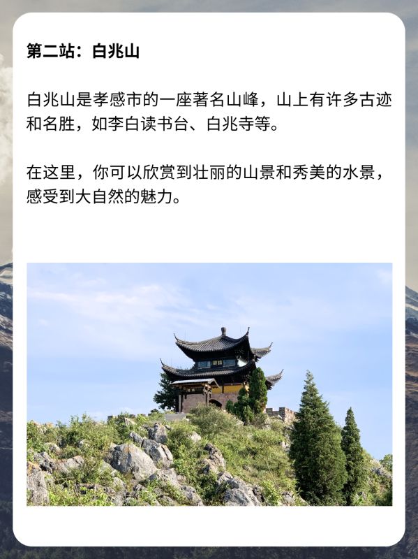 白兆山是孝感市的一座著名山峰,山上有许多古迹和名胜,如李白读书台、白兆寺等。
