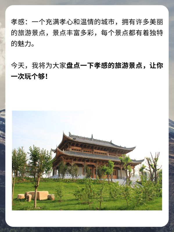 孝感市位于湖北省中部,素有“咸鱼翻身之城”的美誉,是一座历史悠久、文化底蕴深厚的城市。它拥有众多的旅游胜地,以下是介绍孝感景点的几个地方: