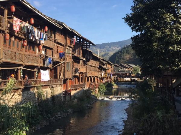 肇兴侗寨四面环山,寨子建于山中盆地,两条小溪汇成一条小河穿寨而过。我们居住的水岸肇兴就建在河边,从房间里推开窗,不禁心旷神怡,对面的山、水、鼓楼、绿树青瓦映入眼帘,美得没有一点瑕疵,如果有什么办法能打包带走的话,我一定照单全收。