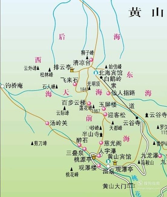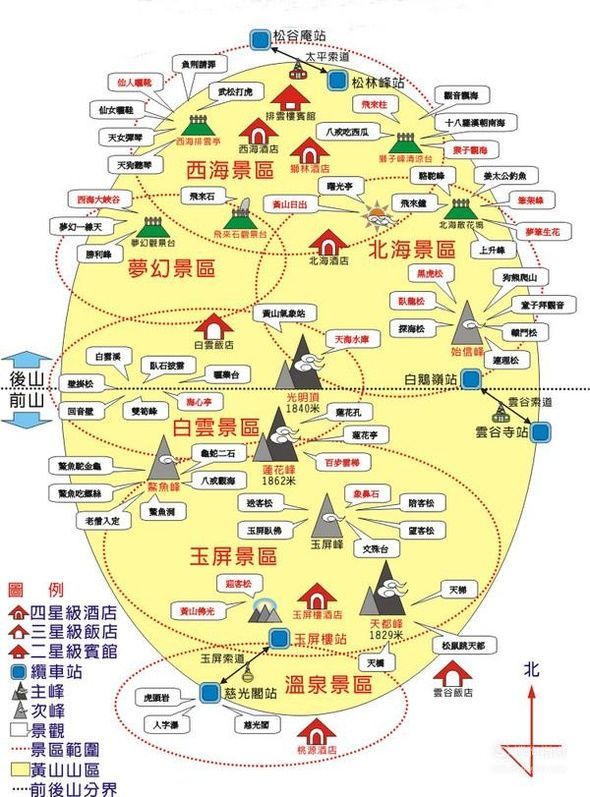 黄山景区内的山峰分布地图,可作为主地图使用。如图所示: