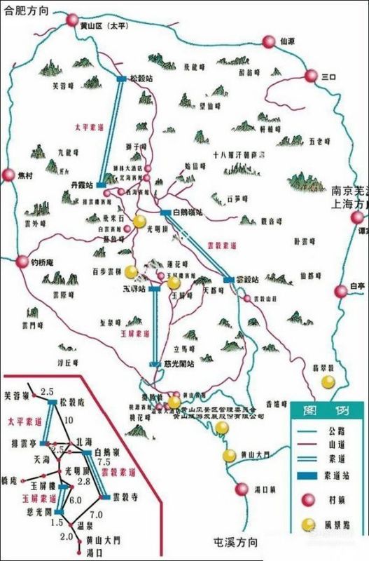 这是以我个人的亲身体验介绍景点的真实情况,绝无复制,一字一字打上去的!推荐经济但不敷衍的日程,保证以最快的时间游览最值得的景点,力图传达给你直接的旅游线路,为你提供真正有用的信息。如有个别地方不详或想了解更多的信息,可以随时追加提问联系我。 黄山快速旅游路线:游线1 屯溪老街→温泉景区(人字瀑、百丈瀑)→住温泉游线2 观日出→游黄山景区→返回温泉游线3 徽州区一日游游线4 歙县一日游游线5 绩溪一日游游线6 屯溪→黟县一日游游线7 泾县一日游 通常人们所说的黄山是指黄山风景区,从地理上来说,黄山风景区是归属黄山市的,它距离屯溪还有68公里。黄山区位于黄山市的北部,它虽然离黄山风景区较近,但交通不如屯溪便利。 黄山风景区内交通主要包括:景区公共汽车、游览步道和索道。其中,景区公路4条、游览步道30余条、索道3条。【黄山景区索道】:一索:云谷寺→白鹅岭二索:松谷庵→松林峰三索:慈光阁→玉屏楼(淡季65元,旺季80元) 黄山:202元(旺季通票,含保险费2元)。102元(淡季通票,11月16日—8月15日)【重点提醒】:登山注意事项1、最好先备有手杖及雨衣,虽然山下有卖,不过雨衣最还自己带。2、山上早晚温差大,但因为山上的路对于很多人来说,都十分的艰险也很费劲,通常是走了一半就大汗淋漓,所以尽量不要带太多的不必要的东西,山上有大衣一类防寒用品出租。3、登山一定要有一双好鞋,以旅游鞋为最佳。4、拍照时要注意脚下的安全。 云谷景区:翡翠谷旺季50元,淡季40元,学生票25元; 九龙瀑布43元。翡翠谷风景区0559—5577644九龙瀑布风景区0559—5561459 【特别提醒】:黄山看日出的最佳地点是:曙光亭、清凉台、狮子峰、丹霞峰、始信峰、棋石峰、贡阳山、光明顶、白鹅岭、石笋峰、玉屏峰、莲花峰、天都峰等处。观日出的人多,地方狭小,一定要注意安全。 黄山观晚霞最理想的地方有:西海排云亭、丹霞峰顶、飞来峰、石柱峰、棋石峰、光明顶、莲花峰等处。 【吃喝黄山】:黄山菜系属中国八大菜系之一的徽菜,徽菜比较讲究用料和火候,对菜的色、香、味的统一尤其强调。 【最后提醒】:建议不要在风景去买任何特土产,如茶叶、石耳、香茹等,可以在市区屯溪老街购买! 祝你旅途愉快!!!
