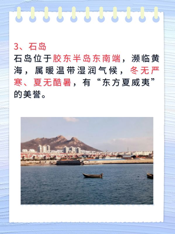 3.石岛:位于胶东半岛东南端,濒临黄海,属暖温带湿润气候,有“东方夏威夷”的美誉。