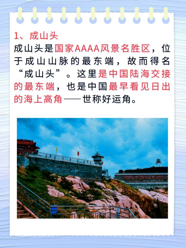 1.成山头:国家AAAA风景名胜区,位于成山山脉的最东端,是中国陆海交接的最东端,也是中国最早看见日出的海上高角。