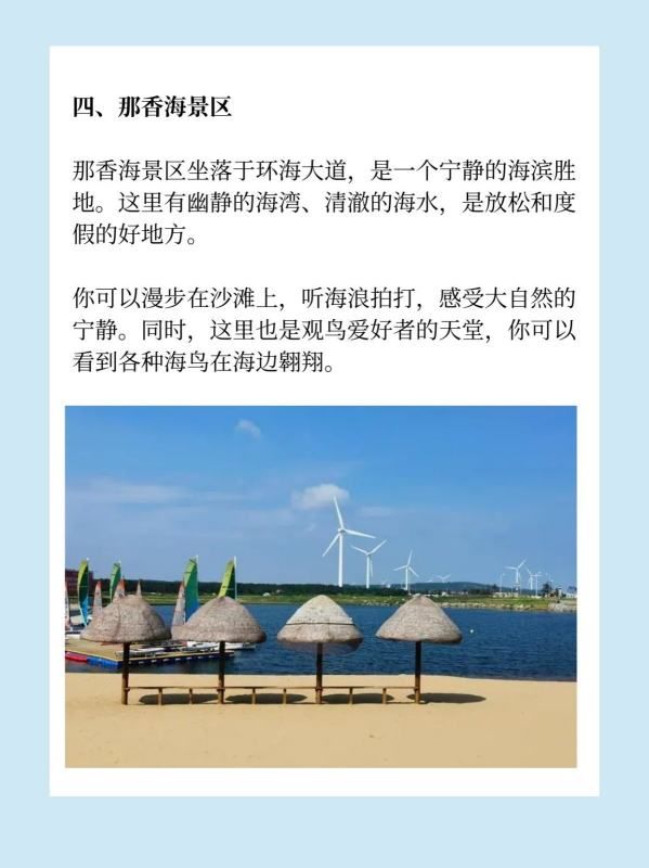 那香海景区坐落于环海大道,是一个宁静的海滨胜地。这里有幽静的海湾、清澈的海水,是放松和度假的好地方。