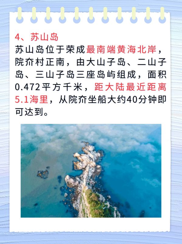 4.苏山岛:位于荣成最南端黄海北岸,由大山子岛、二山子岛、三山子岛三座岛屿组成,距大陆最近距离5.1海里。