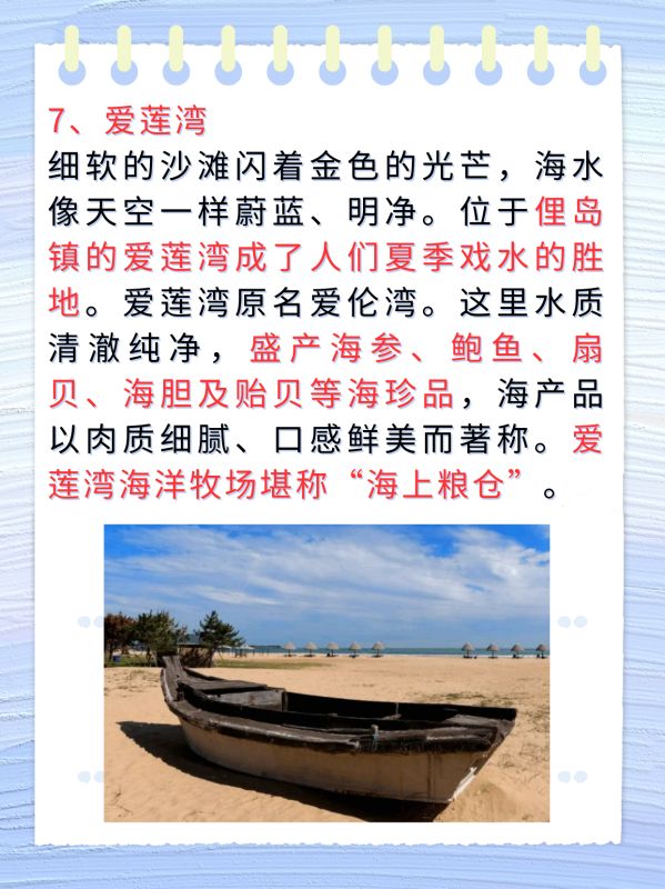 7.爱莲湾:细软的沙滩闪着金色的光芒,海水像天空一样蔚蓝、明净,成了人们夏季戏水的胜地。