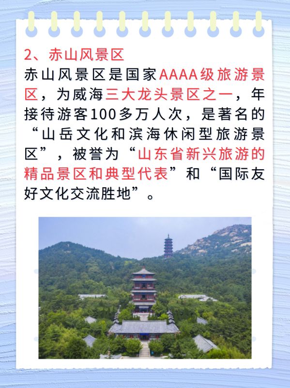 2.赤山风景区:国家AAAA级旅游景区,威海三大龙头景区之一,年接待游客100多万人次,被誉为“山东省新兴旅游的精品景区和典型代表”和“国际友好文化交流胜地”。