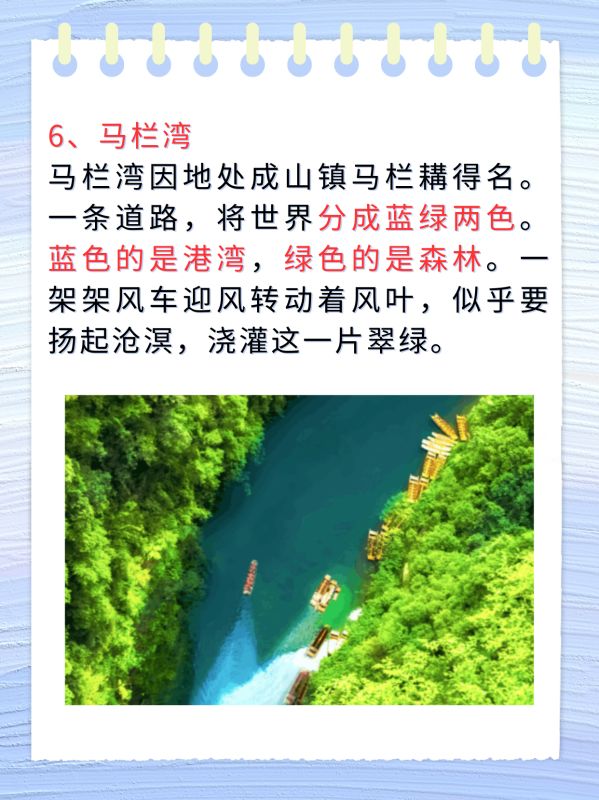 6.马栏湾:因地处成山镇马栏耩得名,一条道路将世界分成蓝绿两色,蓝色的是港湾,绿色的是森林。