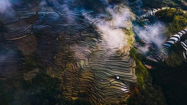 4. **云南**:云南的西双版纳和元阳梯田在冬天也是美景如画,尤其是元阳梯田,在灌水期时会展现出千百个镜面,倒映着天空和周围的景色,堪称大自然的杰作。