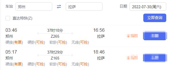 郑州到拉萨的火车时刻分别为:Z265车次是03:46~16:56、Z165车次是05:17~18:46.