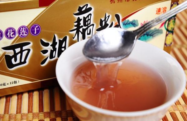 西湖藕粉是浙江省杭州地区名产之一。其风味独特,富含营养,旧时是为皇家提供“贡粉”。 藕是荷花在地下的茎,经特别加工制成的藕粉,呈薄片状,质地细滑,色泽白中透红。服用时只需先用少量冷水调和,再用开水冲调成糊状即可,冲泡后的藕粉晶莹透明,口味清醇,有生津开胃,养血益气的功效,是极适用于婴孩、老人、病人的滋补品。
