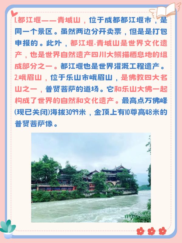1.都江堰——青城山,世界自然遗产四川大熊猫栖息地的组成部分之一。都江堰也是世界灌溉工程遗产。