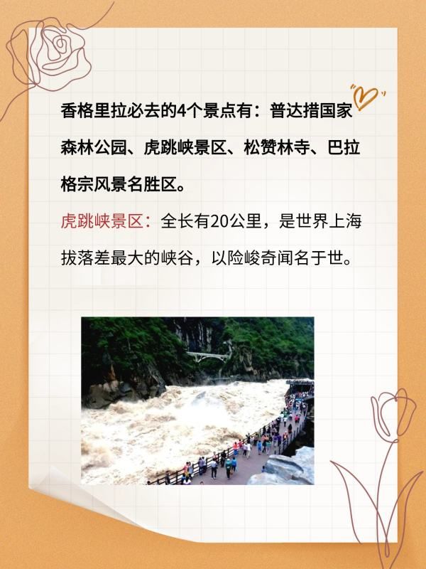 虎跳峡景区:全长有20公里,是世界上海拔落差最大的峡谷,以险峻奇闻名于世。