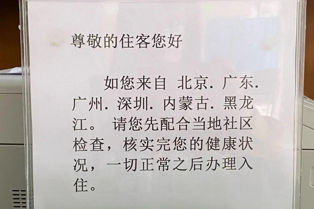 高风险地区去新疆的人员,如果没有核酸检测证明,会被直接隔离。即使没有被隔离,也可能没有酒店愿意接待你。这是我在某个酒店前台拍的告示:
