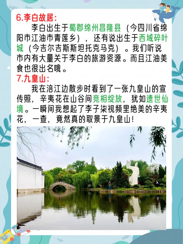 李白出生于蜀郡绵州昌隆县(今四川省绵阳市江油市青莲乡),还有说出生于西域碎叶城(今吉尔吉斯斯坦托克马克)。我们听说市内有大量关于李白的旅游资源。而且江油美食也很出名哦。